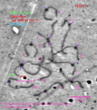 Given an estimated length of 6.7µm for chromosome 1P and the mean percentage above, this BAC is approximately 5.6µm±0.1µm from the chromosome centromere.