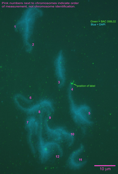 Given an estimated length of 12.7µm for chromosome 6Q and the mean percentage above, this BAC is approximately 12.5µm±0.2µm from the chromosome centromere.